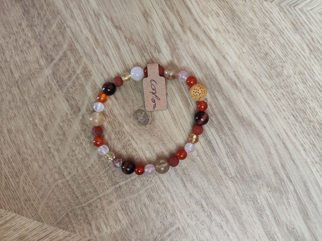 Compose de cornaline, oeil de taureau, quartz rose, jaspe rouge, citrine et une pierre de lave afin de diffuser des huiles essentielles si envie ou besoin.