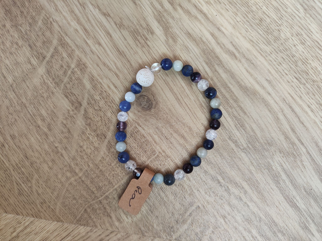 Composé de lapis lazzuli, cristal de roche, fluorine, sodalite, aigue marine et une pierre de lave afin de diffuser des huiles essentielles.
